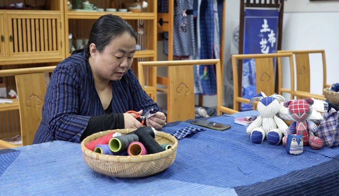 陆金凤与土布的故事还要从十年前说起。陆金凤是土生土长的廊下人,作为服装打版师,她对手工纺织染色的纯天然土布情有独钟。十年前,她开始正式接触土布,并为土布寻找新的出路,从组织非遗土布展览,到送土布课程进村居、学校、企业等,让土布紧跟时代潮流。如今,在她的工作室内,土布被开发出玩偶公仔、书签、手提包、小挂饰以及旗袍服饰等一系列产品,获得不少市民的喜爱,也让陆金凤充满获得感。
