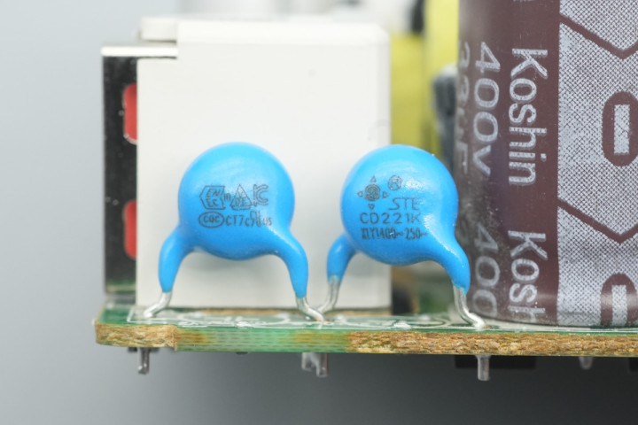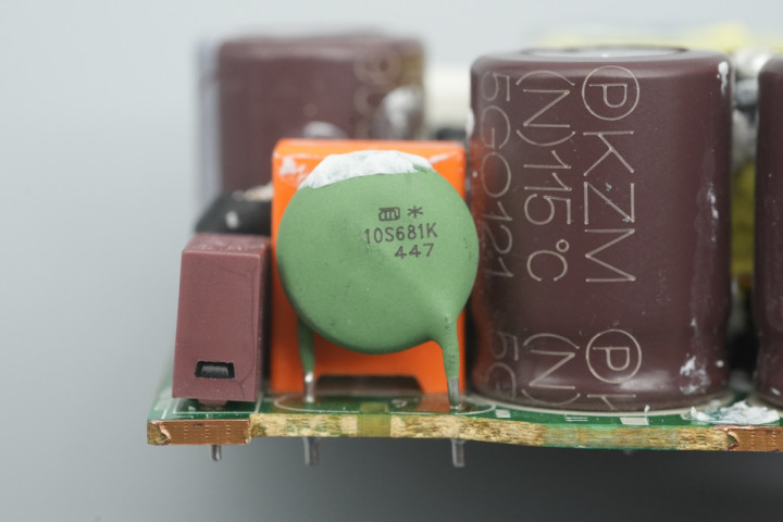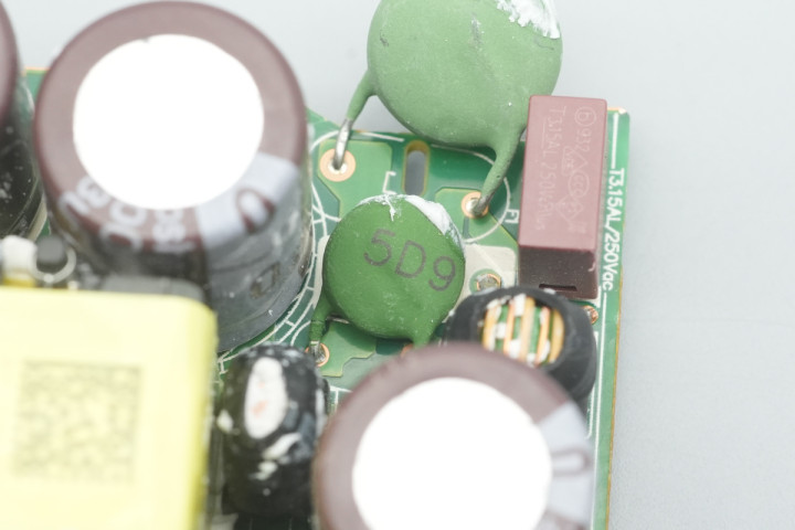 PCBA模块输入端一览,设有保险丝,压敏电阻,安规X2电容和高压滤波电容。