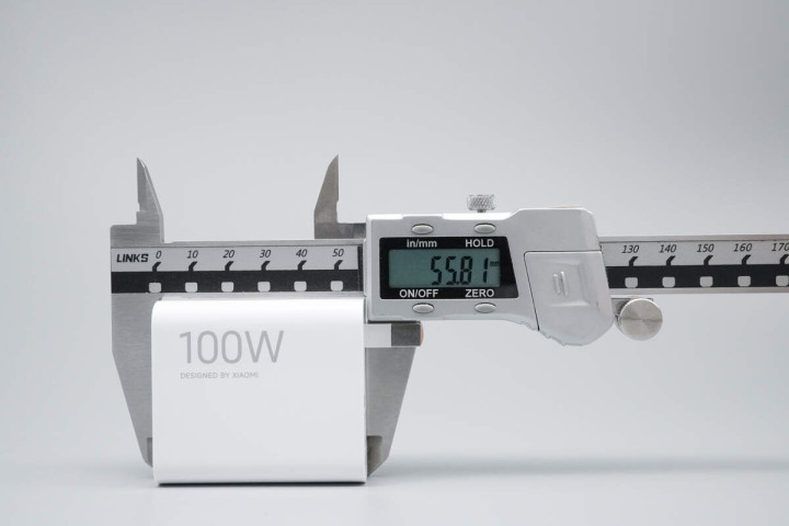 使用游标卡尺测得充电器机身长度约为55.8mm。
