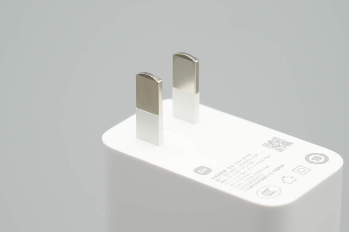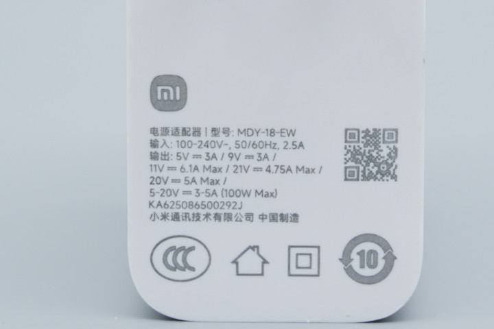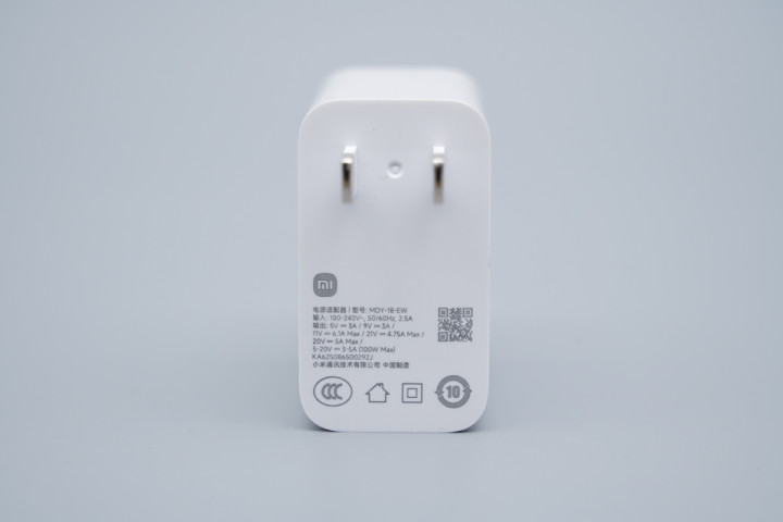 小米这款100W快充充电器采用经典直板造型设计,壳体为PC阻燃防火材质,表面高光亮面处理。