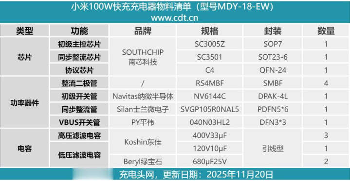 最后附上小米100W快充充电器的核心器件清单,方便大家查阅。