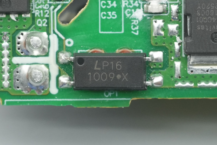 PCBA模块背面中间上方位置设有四颗整流二极管,下方设有初级主控芯片和氮化镓开关管,左侧设有同步整流控制器,同步整流管,协议芯片和VBUS开关管,底部设有反馈光耦,初次级之间通过开槽插入隔离板绝缘。