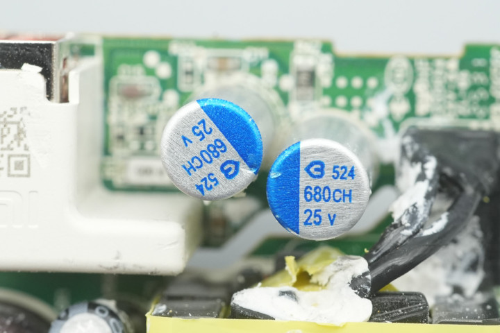 滤波固态电容来自绿宝石,规格为680μF25V,两颗并联。