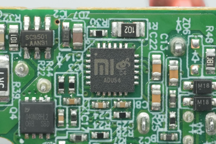 协议芯片由小米向南芯科技定制,芯片丝印了小米和南芯科技两家品牌logo,并丝印C4型号。芯片内部集成32位高性能MCU,支持零待机功耗功能。芯片内部集成LDO,集成VBUS开关管驱动器和VBUS放电。