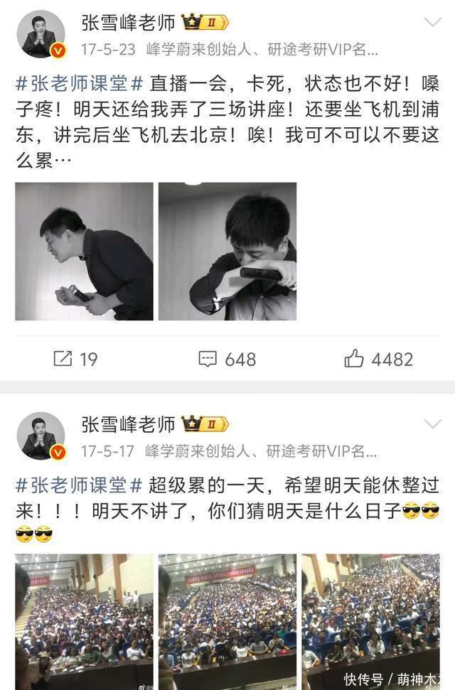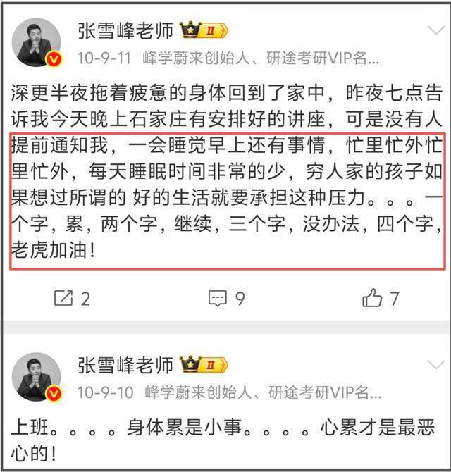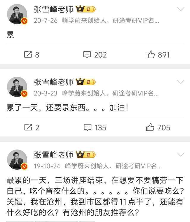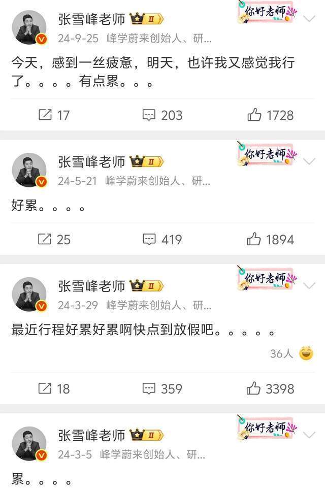 十几年时间,张雪峰发了几十条喊累的微博,早年没日没夜到处跑线下讲座,累到不想生活,累到想哭,走红之后,工作量更大了,连过生日都觉得累。
