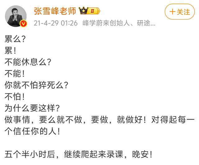 2021年,张雪峰公开喊话不怕猝死,评论区直接就沦陷了,热评第一条就是“你的每一条微博都可能成为遗言,保重身体!”