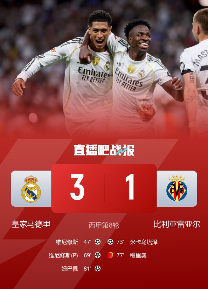 直播吧10月5日讯直播吧10月5日讯西甲第8轮,皇家马德里坐镇主场伯纳乌迎战比利亚雷亚尔。上半场杭州股票配资网,马斯坦托诺失良机,库尔图瓦拒单刀。易边再战,维尼修斯个人秀破门+造点+点射,米卡乌塔泽远射世界波,穆里奥两黄被罚下,姆巴佩破门后伤退。最终皇马3-1黄潜。积分榜方面,皇马21分先赛登顶,黄潜16分第三。