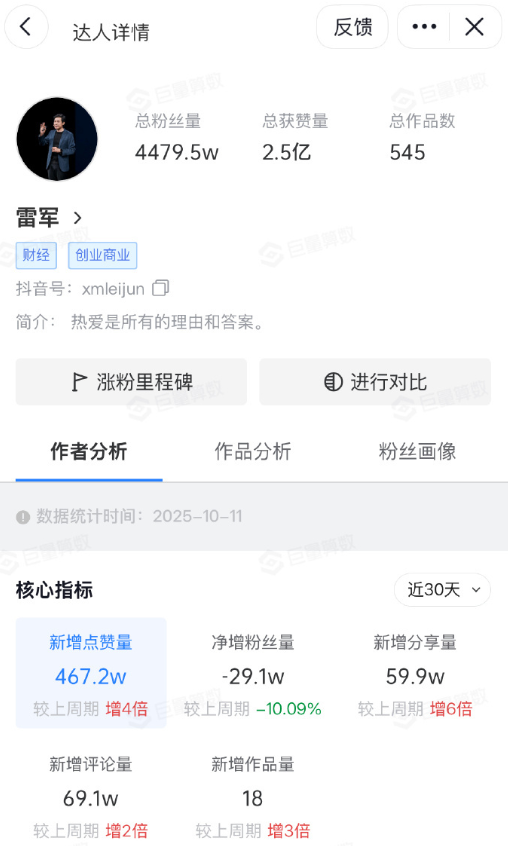 10月13日,有网友在查询雷军个人账号时发现,近30天(9月11日-10月11日)雷军粉丝净增为负数,掉粉29万多。